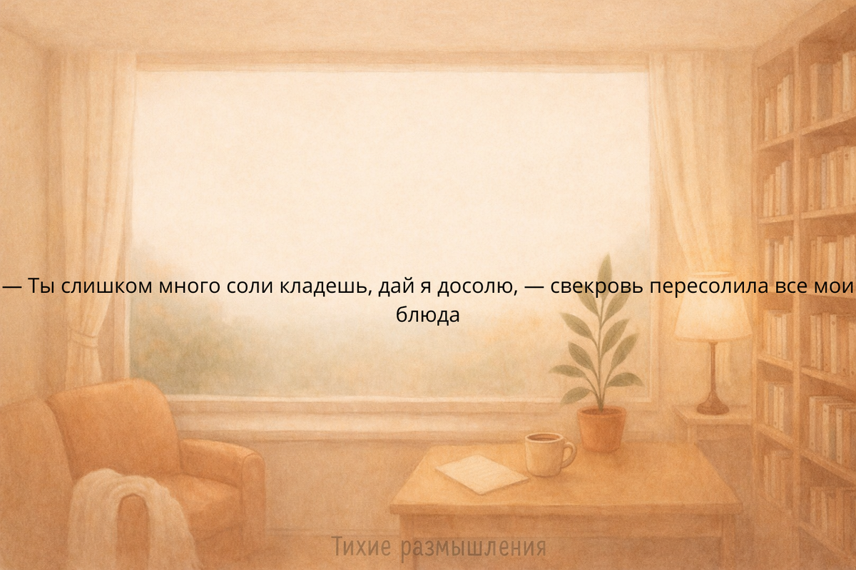 А она просто не хотела, чтобы я была хороша. Ей нужна была невестка, которая зависит от её помощи, которая всегда будет на шаг позади. И я послушно играла эту роль, пока сама не поверила, что действительно не умею готовить.