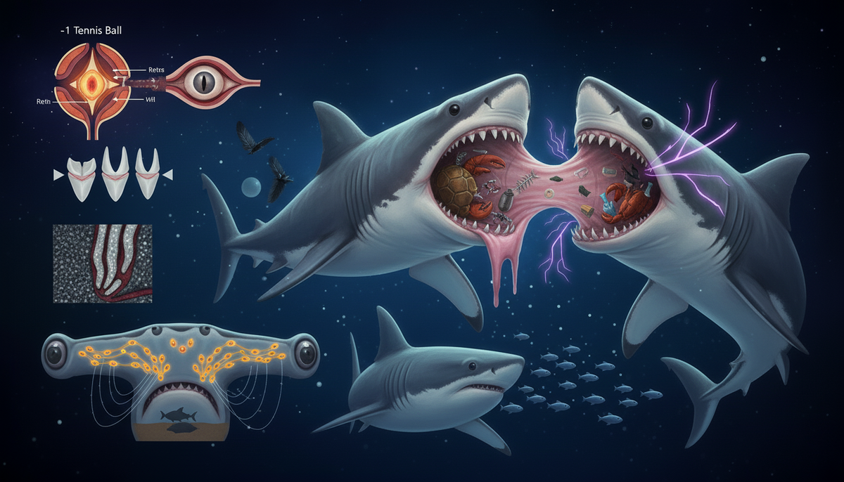 В тёмных глубинах мирового океана обитают одни из самых совершенных хищников на планете — акулы. На протяжении миллионов лет эволюция наделила их невероятными адаптациями, превратив в настоящих мастеров выживания. От способности буквально «выключать» свой желудок до улавливания электрических полей живых существ — каждая деталь их анатомии и поведения направлена на эффективную охоту, защиту и передвижение в бескрайней водной стихии. Некоторые акулы обладают удивительной способностью выплёвывать свой желудок, а затем вправлять его обратно. Это позволяет им избавляться от неперевариваемых остатков пищи — таких как панцири морских черепах, клювы, перья, кости и клешни омаров. После «очистки» акула в считаные секунды возвращает желудок на место, и процесс занимает не больше секунды. У некоторых видов, например у больших белых акул и акул-мако, есть уникальная система подогрева глаз и мозга: сетчатка повышает температуру этих органов, улучшая восприятие движения и разрешающую способность зре