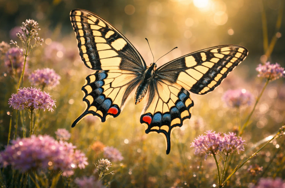 Чтобы увидеть эту красоту в полете, нужно отправиться на открытые пространства: цветущие луга, лесные опушки, берега рек, заброшенные поля или даже в просторные сады. Махаон предпочитает места, богатые нектаром и солнечным светом. Его полет — это не суетливое порхание. Он летит мощно, планируя, с четкими и сильными взмахами крыльев. Часто можно наблюдать, как самец патрулирует свою территорию, пролетая по одному и тому же маршруту, или как бабочка, не делая ни единой остановки, преодолевает большое расстояние в поисках корма или партнера. При этом махаоны — прекрасные опылители. Они с особым удовольствием посещают цветы синих, фиолетовых и розовых оттенков, отдавая предпочтение растениям из семейств зонтичных и сложноцветных. Их длинный хоботок, свернутый в спираль в состоянии покоя, позволяет добывать нектар даже из глубоких венчиков.