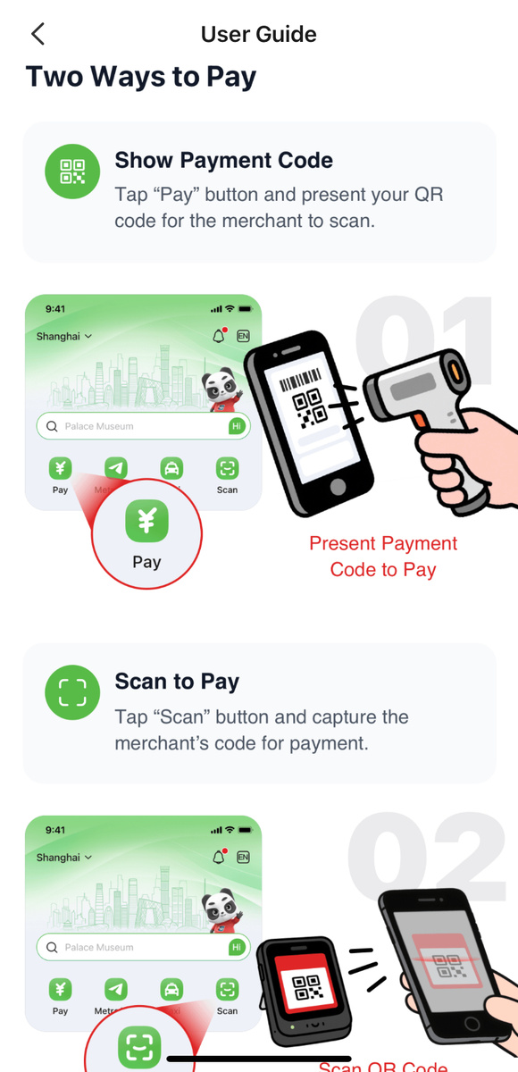 В Nihao China можно зарегистрироваться по e-mail или через Apple ID и привязать зарубежную карту: UnionPay, Visa или Mastercard. Приложение сразу показывает курсы валют и позволяет платить как онлайн, так и в обычных магазинах. Онлайн - покупка билетов на поезда, доставка еды, брони