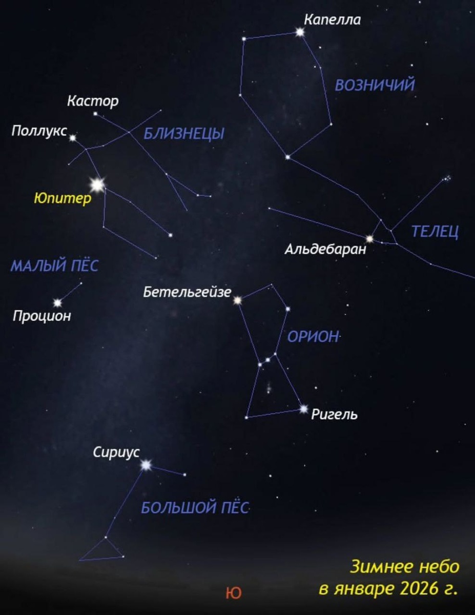 10 января будет противостояние крупнейшей планеты Солнечной системы. Противостояние — значит, что Юпитер располагается на небесной сфере строго напротив Солнца, то есть противостоит ему. В такие периоды планета видна всю ночь и проходит через небесный меридиан около полуночи. Для наблюдателей северного полушария зимние противостояния особенно благоприятны: в это время Юпитер поднимается максимально высоко над горизонтом, а чем выше планета над горизонтом, тем меньше влияние атмосферы и тем больше мы можем увидеть деталей на её диске. Кстати, в 2025 году противостояния Юпитера не было вовсе. Причина проста: противостояния самой большой планеты происходят примерно с интервалом в 13 месяцев. Если одно из них приходится на декабрь, как это было в 2024 году, то следующий календарный год оказывается без противостояния. Именно таким и был 2025 год, и именно поэтому январь 2026 года так долгожданен. В это противостояние Юпитер находится в созвездии Близнецов и с блеском около –2,7 звёздной в