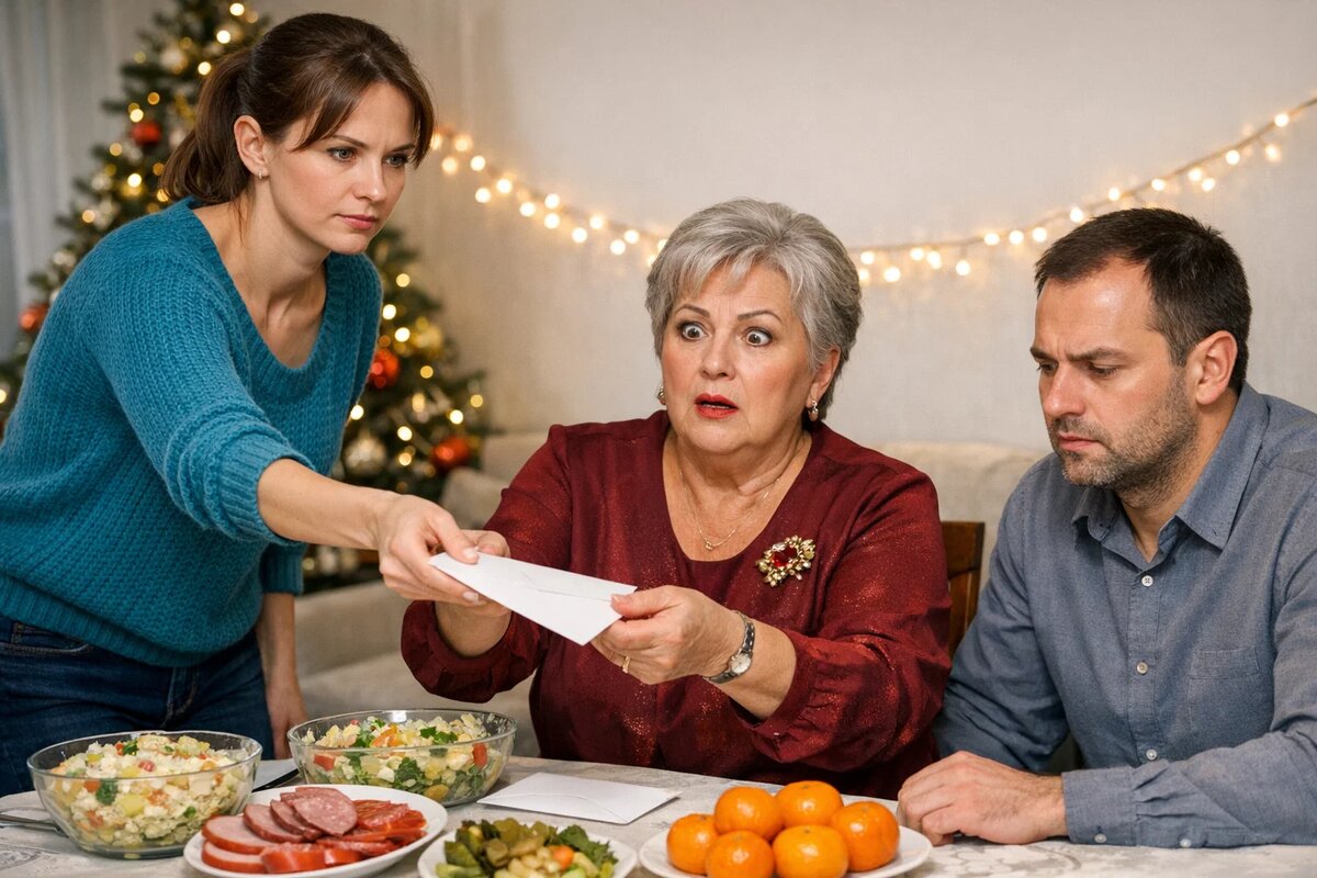 Тишина. Свекровь нахмурилась. Взяла конверт. Вскрыла. Достала бумагу. Глаза пробежали по строчкам. Лицо побледнело.