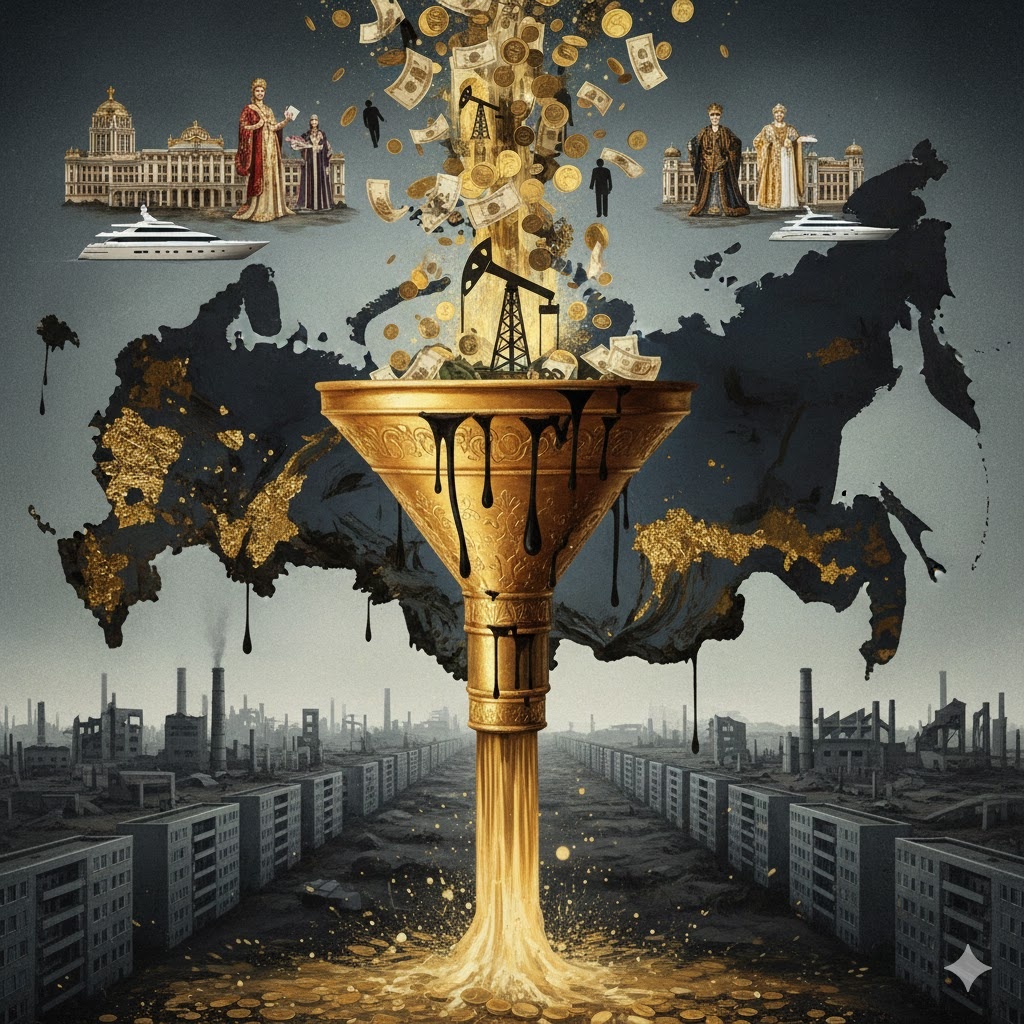 Экспертное мнение экономиста-макроаналитика (Никита Кричевский, доктор экономических наук, бывший советник министра финансов): «Мы наблюдаем классический феномен, который я бы назвал «стагнирующим профицитом». Деньги от продажи национальных ресурсов аккумулируются в бюджете и фондах национального благосостояния, но экономический механизм их трансформации в рост благосостояния граждан и диверсификацию экономики — сломан. Эти средства выполняют две основные функции: во-первых, они служат финансовой подушкой безопасности для самой власти и элит, стабилизируя систему в условиях санкций; во-вторых, через систему госкорпораций, госзакупок и фискальных льгот они циркулируют обратно в сырьевой и близкий к власти финансовый сектор. Возникает «бюджетная воронка»: рента извлекается из недр, проходит через казну и в значительном объеме возвращается узкой группе акционеров и топ-менеджеров сырьевых и государственных гигантов, минуя широкие слои населения. Экономика при этом не получает импульсов для диверсификации, оставаясь в сырьевой ловушке, а население выступает в роли донора, а не бенефициара».