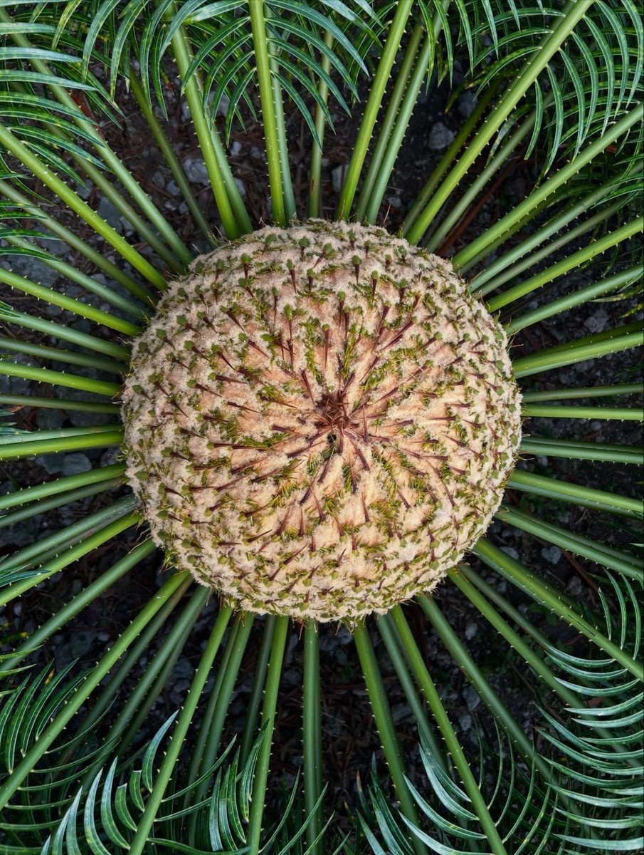 🌿 появился древний страж времени — Cycas tansachana. Он рос медленно и терпеливо, впитывая солнце и силу камня. Его ствол, окрашенный в золотисто-коричневые оттенки, со временем поднимался всё выше, пока не достигал высоты до 5 метров, а над ним раскрывалась мощная крона с листьями длиной до полутора метров — словно крыша древнего храма, укрывающая тайны прошлого. В редкие моменты он раскрывает знаки продолжения рода: прямостоячие мужские шишки, спокойные и величественные, и плотные «закрытые» женские шишки, в которых зреют семена — гладкие, округлые, созревающие до насыщенного жёлтого цвета, как маленькие солнечные амулеты 🌞 Cycas tansachana любит свет. Он принимает и яркое солнце, и лёгкую полутень, но без прикосновения солнечных лучей его рост замирает — словно древний дух, лишённый источника силы. Этот вид — не просто растение. Это живая легенда, сохранившаяся с доисторических времён. Некоторые растения не украшают сад. Они делают его частью истории 🌴