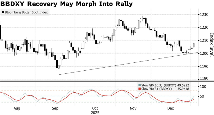 В понедельник курс доллара вырос до двухнедельного максимума, поскольку захват президента Венесуэлы Николаса Мадуро силами США спровоцировал рост геополитических рисков и бегство инвесторов в безопасные активы Восстановление долллара может перерасти в ралли. Источник: Bloomberg Реакция рынков оказалась неоднозначной: цены на нефть упали, а драгоценные металлы и акции резко подорожалиИндекс доллара Bloomberg Dollar Spot вырос на 0,3%, достигнув максимума с 22 декабря. Евро упал на 0,3%, а мексиканский песо — на 0,7%. Трейдеры переходят в доллар на фоне неопределенности после заявления президента Дональда Трампа о том, что Вашингтон планирует «управлять» Венесуэлой после смещения Мадуро. Рынки отреагировали на новость о захвате Мадуро смешанно. Цены на нефть, вопреки ожиданиям, снизились: марка Brent опустилась до $60,58 за баррель. Аналитики связывают это с тем, что нефтяная промышленность Венесуэлы находится в упадке, и ее быстрое восстановление маловероятно. При этом мировые запасы не