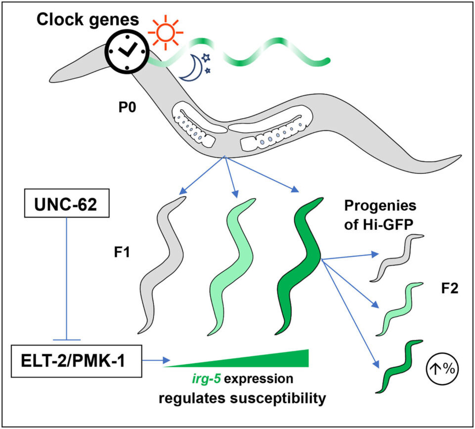 После 2017 года, когда Нобелевскую премию по физиологии или медицине получили Джеффри Холл, Майкл Росбаш и Майкл Янг за исследования молекулярных механизмов циркадных ритмов, в мире наблюдается всплеск исследований в этой области. В том числе – и в области связи циркадных ритмов с иммунитетом. Одна из таких работ опубликована в журнале Science Advances. Популярное изложение этой новости озаглавлено многообещающе – дескать циркадные ритмы матери влияют на восприимчивость детей к бактериальной инфекции. Но есть одно огромное трансляционное «но»: исследование проведено на не очень близком к человеку организме – нематоде. И здесь можно говорить как о циркадных ритмах матери, так и отца. Графический абстракт статьи. Credit: Jonathan Lalsiamthara et al / Science Advances 2026 В терапии бактериальных инфекций, равно как и к восприимчивости пациентов к ней, все не очень просто. Многие пациенты по-разному реагируют на лечение, что подчеркивает необходимость изучения факторов, которые могут вли