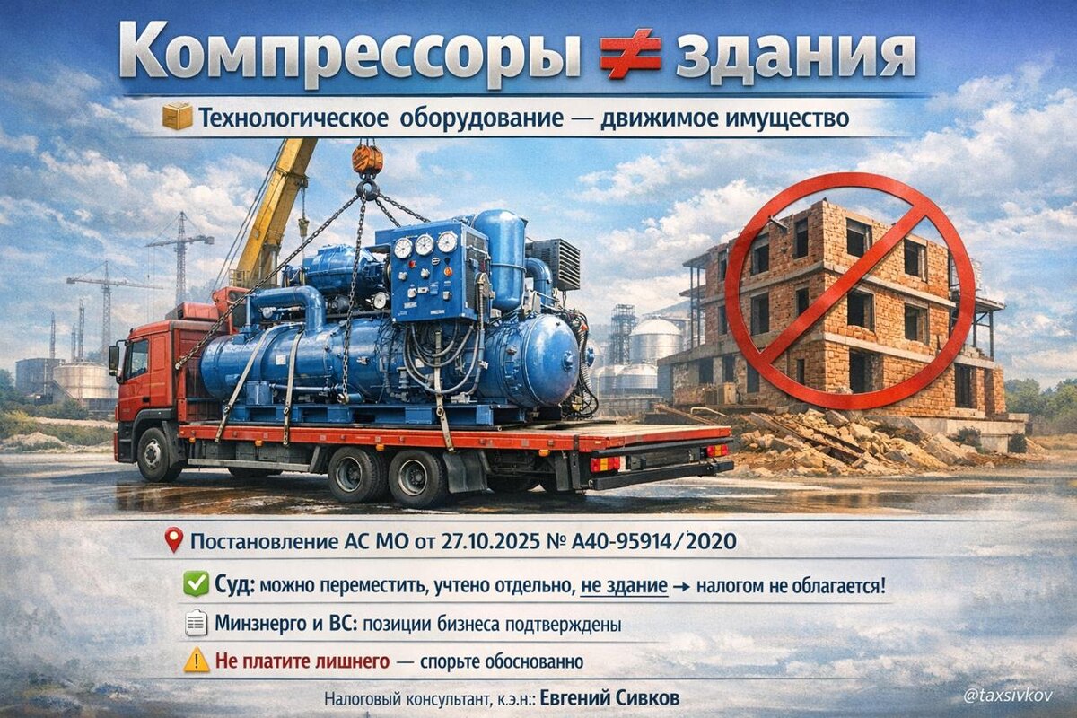 ! 🚫 Инспекторы снова пытались обложить налогом на имущество компрессоры и системы обогрева. Но суды разобрались: технологическое оборудование — движимое имущество. 📌 Постановление АС Московского округа от 27.10.2025 № А40-95914/2020 ✅ Победила компания. 🔍 Суть: ФНС посчитала, что оборудование прочно связано с недвижимостью и включила его в налогооблагаемую базу. Но кассация указала: — оборудование учтено обособленно, — пригодно к перемещению, — не имеет единого срока службы. Следовательно, налогом не облагается! 📄 ВС РФ тоже поддерживает такую позицию: в определении от 15.05.2024 № 305-ЭС24-7176 отмечено: даже зарегистрированный комплекс может включать разнородные объекты, и налог должен считаться по каждому отдельно. 💡 Минэнерго в письме от 14.02.2025 № ЕГ-2286/07 уточняет критерии: если объект можно перенести, он не стоит в ЕГРН, и он — не здание по ОКОФ, значит — это оборудование, а не недвижимость. #налогнаимущество #движимоенедвижимое #оборудование2025 #АСМосковскогоокр