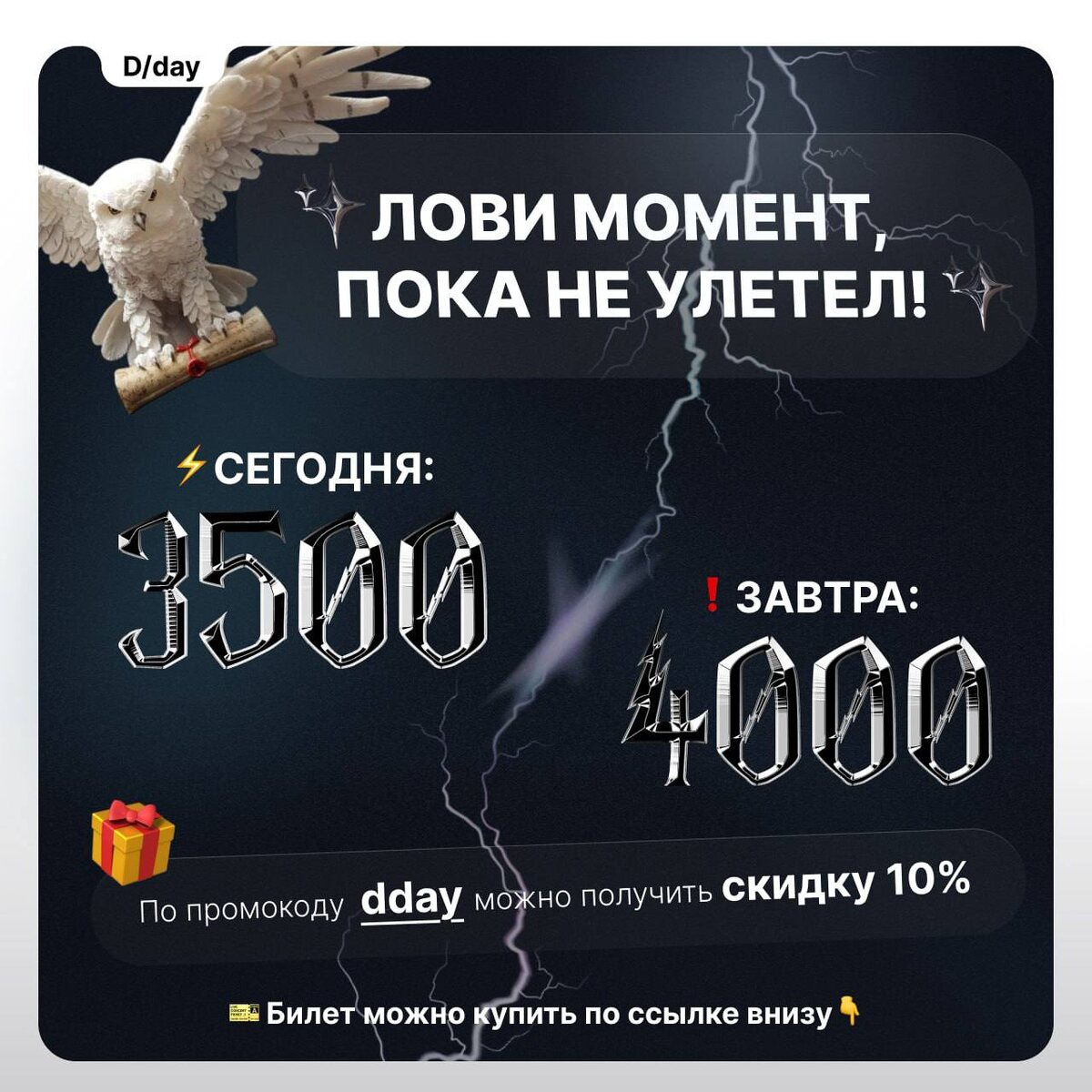 ! 🪄 Спешим сообщить вам важнейшую новость: ❗️Cегодня – последний день, когда вы можете приобрести билеты всего за 3500₽!❗️ Завтра цена поднимется до 4000₽ – и это не шутка про оборотное зелье, а самая настоящая правда! 🕧Спешите! Количество билетов со скидкой ограничено, как запасы зелья удачи у профессора Снейпа. 🎟Купить билеты можно по ссылке: http://hogwarts-day.ru/ #Хогвартс #Волшебство #СрочнаяНовость