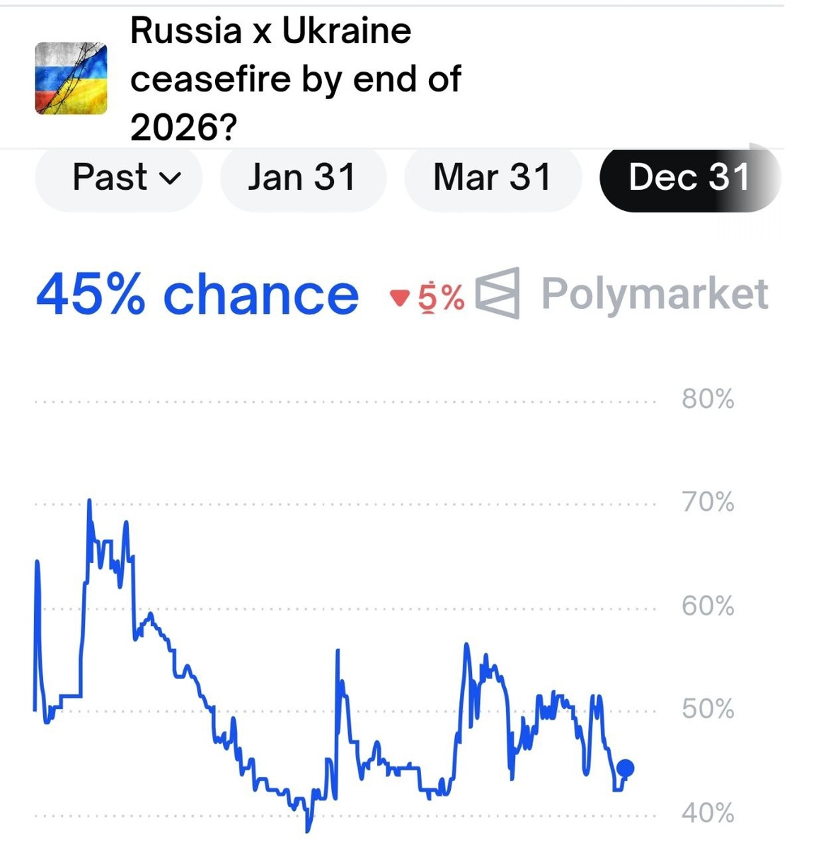 Почему в начале года слабеет рубль 2. Почему индекс Мосбиржи начал 2026г падением 1. Основные продавцы — ЦБ и Минфин. В начале года (в торговые дни на новогодние каникулы) на рынке нет ЦБ, Минфина. Именно они — основные продавцы CNY На Мосбирже в торговые дни 5, 6, 8 и 9 января будет курс ЦБ РФ на 31 12 2025г. Торги есть, а ЦБ нет! 2. Индекс Мосбиржи на фоне общего позитива в мире падает из-за геополитики. Polymarket показывает снижение вероятности прекращения конфликта с Украиной до 31 12 2026г с 50% до 45%