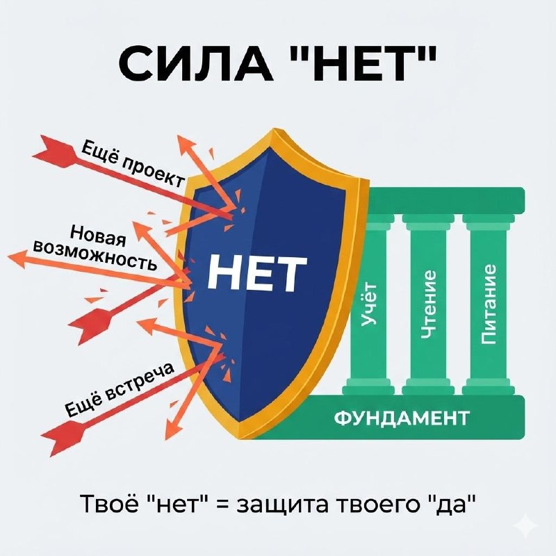 🚫 Помнишь пост про фундамент? Про то, что раньше делал — а потом бросил? Финансовый учёт. Ритм чтения. Структура питания. Те простые вещи, которые держали тебя. Сегодня хочу ответить на вопрос: Почему мы это бросаем? Потому что не умеем говорить "НЕТ". Новому хаосу. Новым "возможностям". Новым задачам. Новому, что съедает старое. Вчера в календаре был вопрос: "Целый день говорить 'да' всему или 'нет' всему?" Я выбрал "НЕТ". Не из жёсткости. А из осознанности. Вот в чём разница: "ДА" ВСЕМУ = ОТКАЗ ОТ РАЗЛИЧЕНИЯ Когда ты говоришь "да" всему — ты живёшь без границ. Решения принимаются не из смысла. А из импульса, давления или желания понравиться. Новая "возможность"? Да. Ещё один проект? Да. Ещё одна встреча? Да. И вот ты уже не ведёшь учёт. Не читаешь по плану. Не питаешься структурно. Потому что "да" всему = хаос. "НЕТ" ТРЕБУЕТ ОСОЗНАННОСТИ Когда ты говоришь "нет" — ты сверяешься. С ценностями. С целями. С ответственностью. С призванием. Каждое "нет" = выбор. Не реакция. Ре