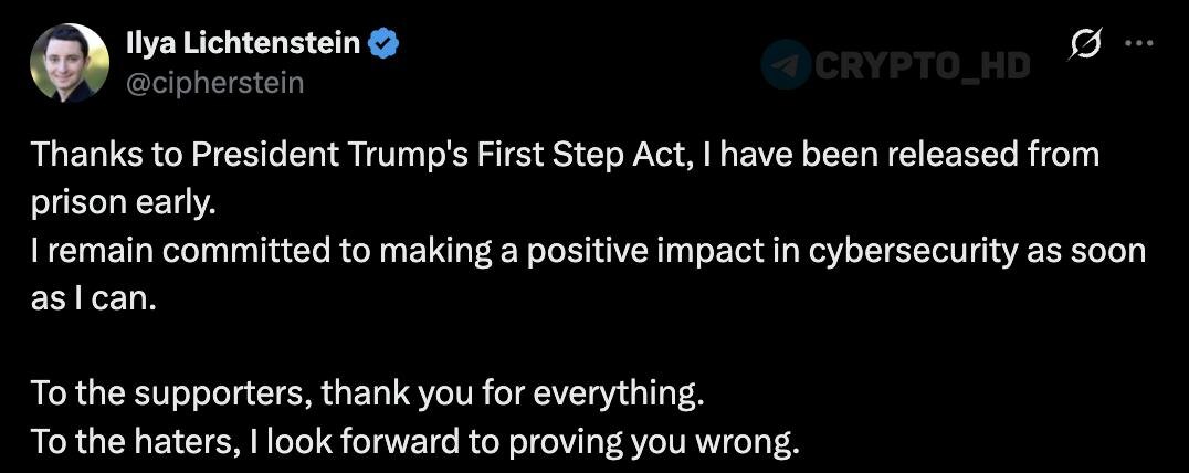 ) Илья Лихтенштейн, причастный к краже ~120,000 BTC с биржи Bitfinex в 2016 году, был досрочно освобожден из тюрьмы. ✦ Ущерб на момент ареста в 2022 году – $4,5b. ✦ Приговор – 5 лет лишения свободы. ✦ Причина освобождения – закон «First Step», принятый при Дональде Трампе. ✦ Закон позволяет сократить срок за участие в реабилитационных программах. Сам Лихтенштейн заявил, что раскаивается и хочет работать в сфере кибербезопасности. Crypto Headlines