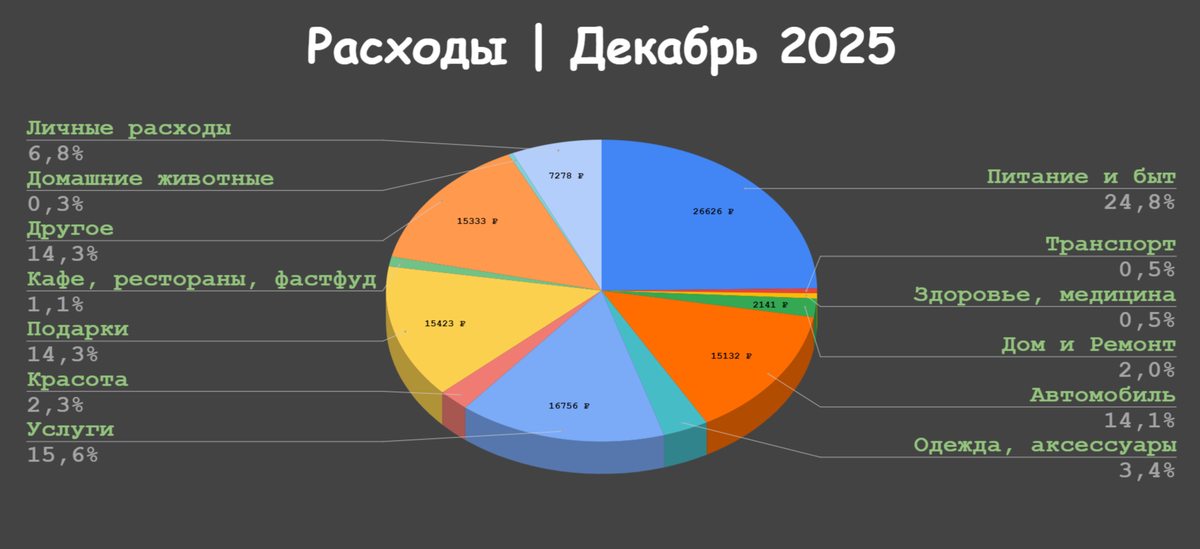 Последний месяц 25 года стал седьмым в котором сумма расходов превысила 100 тыс руб. В 2024 таких месяцев было 3, в 2023 не было совсем, а в 2022 был всего 1 мес, вследствие крупных покупок для обустройства жилья. Получается неизбежно движемся к месячным расходам от 100к+, хотя буквально 2-3 года назад такие траты казались космическими и чересчур расточительными. За декабрь 2025 года потрачено 107 518₽ Расходы по категориям: