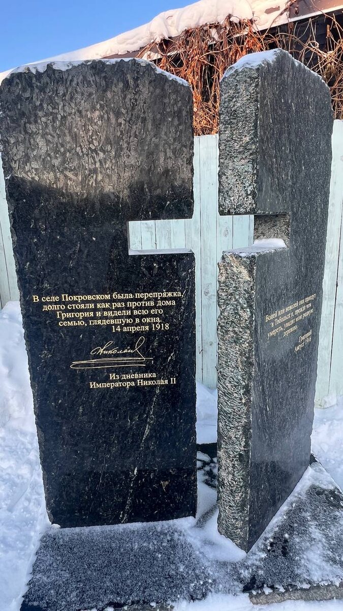 В дневнике государя есть запись, датируемая 14 апреля 1918 года: «В селе Покровском была перепряжка. Долго стояли как раз против дома Григория …» Григорий Распутин предвидел и это событие… съездите в село Покровское, там живая история. В 2008 году супруги Смирновы установили на этом месте памятный знак – гранитный камень с высеченными на нём словами из дневника Николая Второго. Здесь же висит доска с надписью: «29 июня 1914 г. на этом месте было произведено покушение на Г.Е.Распутина»