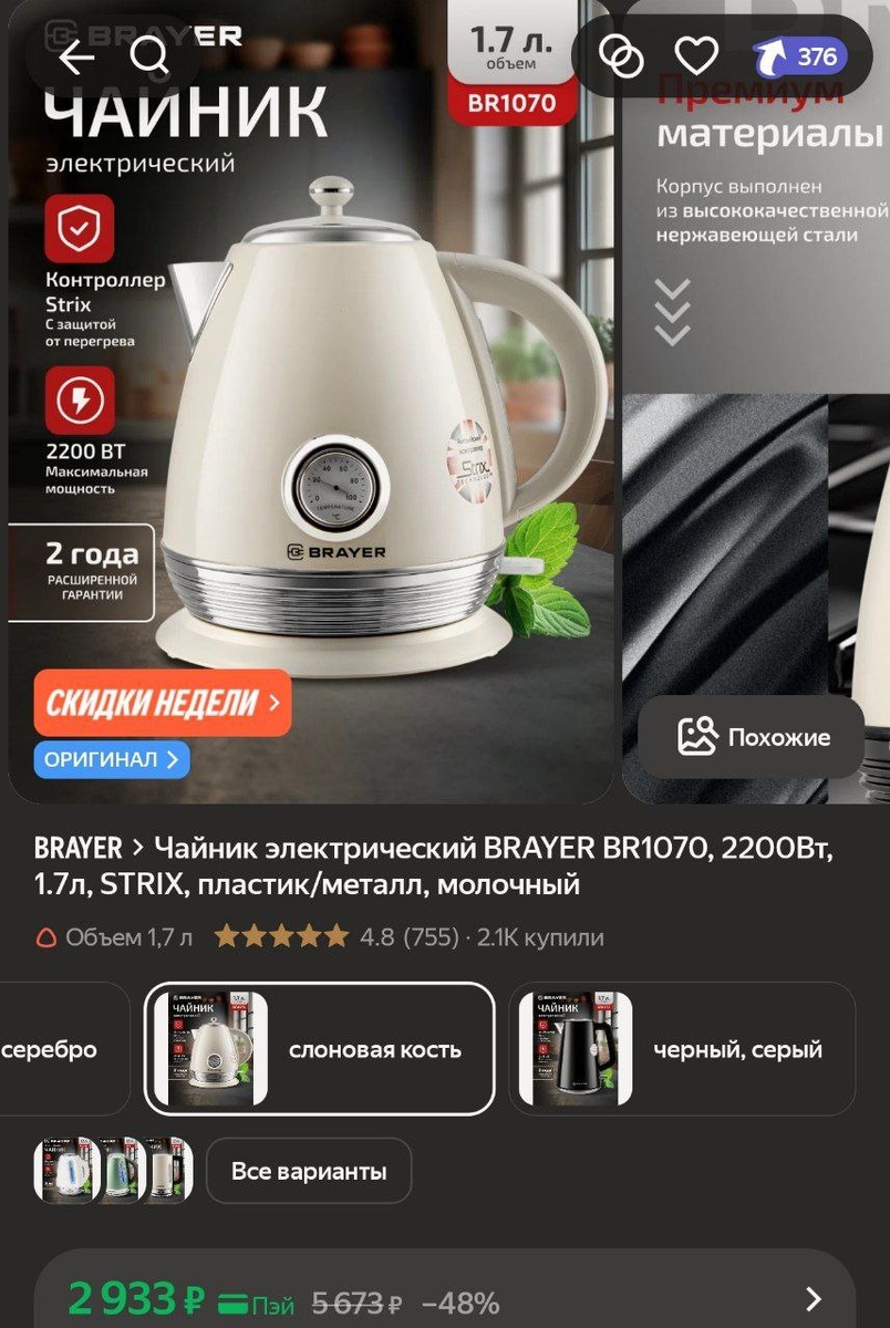Чайник электрический BRAYER BR1070, 2200Вт, 1.7л, STRIX, пластик/металл, молочный за 2933₽