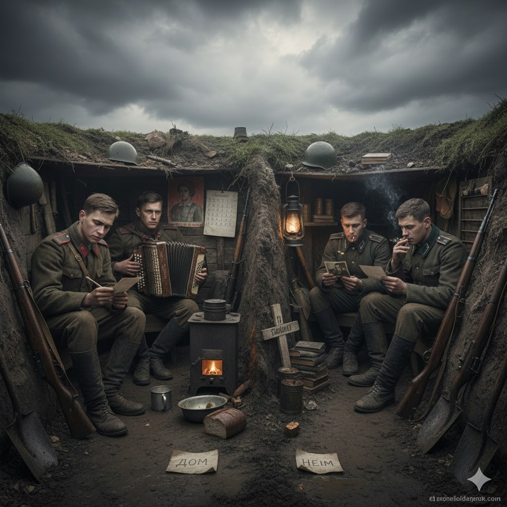 - 🏡 О доме и семье: Это было универсальное лекарство от ужаса. Письма домой, фотографии родных, мечты о мирной жизни — всё это держало на плаву. «Главное — дожить до победы, а потом обнять мать и жену», — писал красноармеец. «Хочу снова увидеть свой сад и выпить пива с отцом», — думал немец.
