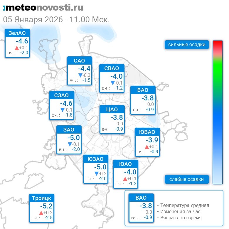 В 11:00 в Москве было от -5.8°C до -3°C, средняя температура -4.2°C #погода #Москва #зима #температура #5января #понедельник