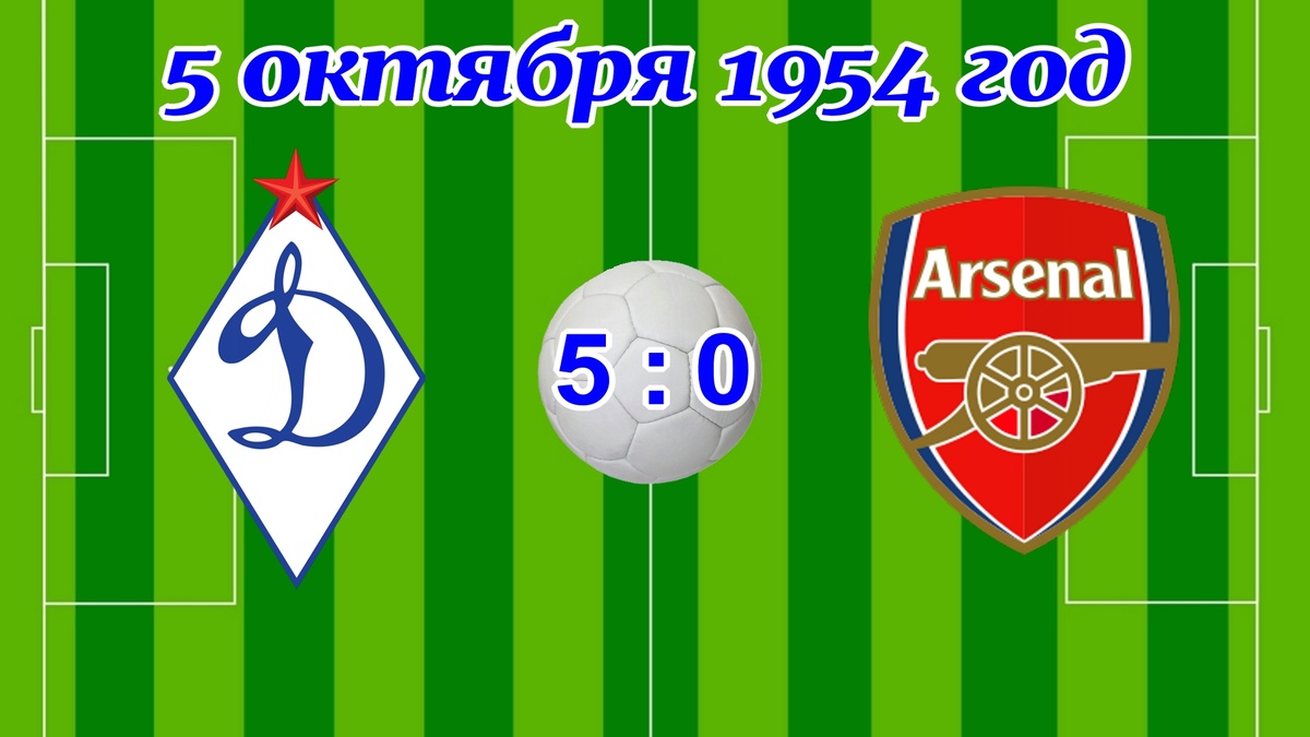 Здравствуйте уважаемые Динамовцы. 5 октября 1954 года на поле стадиона «Динамо» состоялся футбольный матч, завершившийся убедительной победой советской команды над английским клубом "Арсенал". Итоговый счет 5:0 красноречиво свидетельствует о подавляющем превосходстве наших футболистов и их блестящей игре. Московские динамовцы продемонстрировали высочайший класс, умело сочетая стремительные атаки с надежной обороной, и порадовали зрителей дружной, волевой и по-настоящему разнообразной игрой.