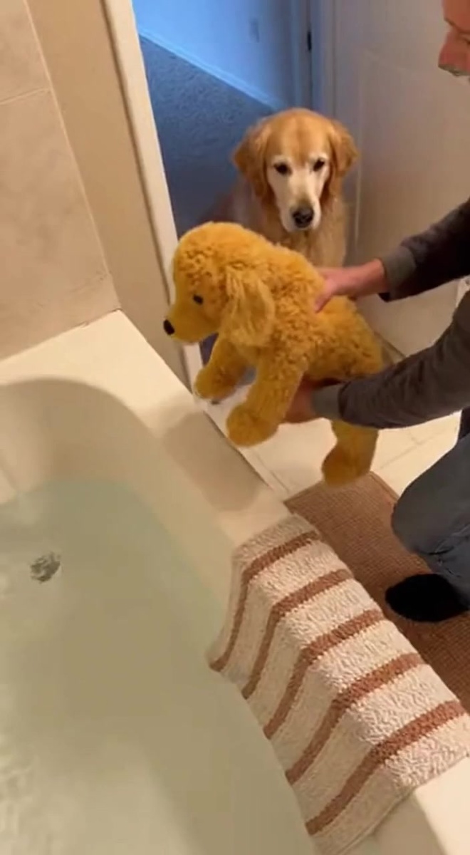 Пока в ванну набирается вода, за дверью терпеливо ждёт золотистый ретривер. Он с любопытством наблюдает за своим хозяином, который опустился на колени у бортиков. Кажется, что всё готово для купания питомца, но вместо этого человек берёт в руки большую плюшевую игрушку, собираясь устроить ей банный день. #золотистыйретривер #собака #домашниепитомцы