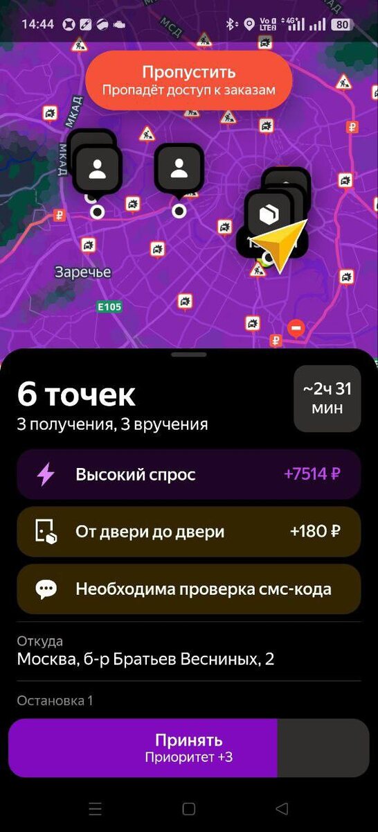 По несколько точек, длинные маршруты, высокий спрос — всё то, что в обычный день видишь редко. На одном из заказов система сразу показала 6 точек и почти 2,5 часа в пути, но при этом доплата за высокий спрос перекрывала все сомнения.