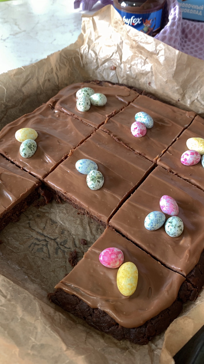 Смазать наш десерт шоколадом, украсить и поставить в холодильник минимум на 1 час. Затем достать из холодильника, нарезать на квадратики и наслаждаться вкуснейшим и супер шоколадным брауни.