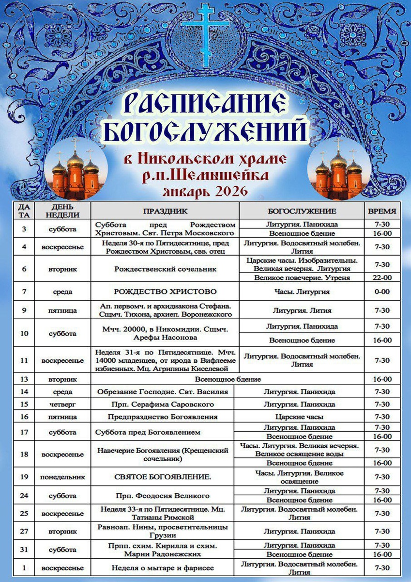 Расписание богослужений в Никольском храме поселка Шемышейка в январе 2026 года