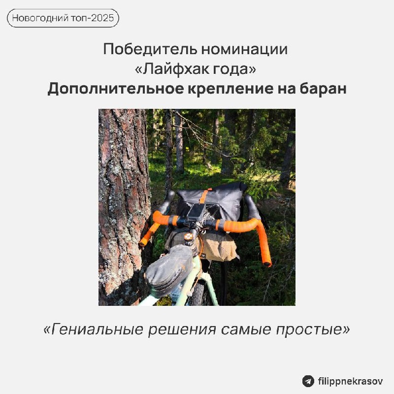 небольшой баул. Авторство - Мите, который открыл нам всем глаза. Казалось бы, так очевидно, но почему-то это драгоценное пространство на руле годами пустовало! В чём гениальность? Просто берёшь обычную 1,5-литровую бутылку или небольшой баул, аккуратно фиксируешь его на руле - и вот ты уже не тратишь время на поиски воды на стоянке или везешь с собой стул. Почему это топ? 1. Просто до гениальности - не требует покупки спецснаряжения - подойдет пара строп или липучек. 2. Решает конкретную проблему - перевозка дополнительной воды для лагеря. 3. Универсально - подходит и для бутылки, и для стула, и для лёгкого баула. Из остального, что стоит упомянуть: Зимнее спасение - аккуратный прогрев газового баллона перед готовкой (да, не рекомендуется, но иначе зимой можно замерзнуть быстрее, чем закипит вода). Волшебная пенка - небольшая складная пенка это и стул, и коврик для переобувания, и подставка под колено, и даже опахало для костра. Максимум пользы при минимуме веса. Стоп-сигнал из на