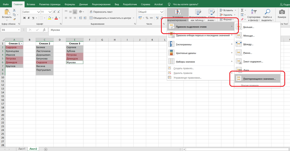 Приветствуем, дорогие читатели! Представьте ситуацию: у вас два списка — клиенты, которым отправили рассылку, и те, кто купил. Или список сотрудников и те, кто уже сдал отчёт. Или просто два прайс-листа от разных поставщиков. Как быстро найти пересечения? Сегодня покажем самый простой способ, который поймет даже новичок. Никаких сложных формул — только 3 клика! Шаг 1: Выделяем данные Просто мышкой выделяем ячейки (Списки), которые хотим проверить на совпадения. Важно: Можно выделять: Шаг 2: Открываем "Условное форматирование" Шаг 3: Выбираем "Повторяющиеся значения" И... ВСЁ! Все совпадения автоматически подсветятся. Нюанс 1: Регистр букв. Excel считает "ООО Ромашка" и "ооо ромашка" разными значениями!