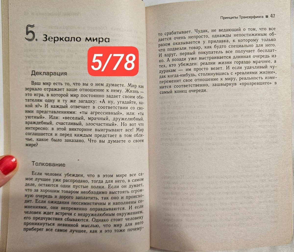 5/78 Практикум управления реальностью - Трансерфинг Зеркало мира "Мир есть то, что вы о нём думаете. Как зеркало отражает ваше отношение к нему. Жизнь - игра, в которой Мир постянно задаёт своим обитателям одну и ту же загадку: "А ну, угадайте, какой я?"... "ты агрессивный/ ты уютный" ... В этой викторине выигрывают все. Мир соглашается и перед каждым предстаёт в том обличии, какое было заказано. ❣Что вы думаете о своём мир?" "Стоит человеку проникнуться невинной мыслью, что мир приберег для него все самое лучшее, как и это почему-то срабатывает. Чудак, не ведающий о том, что всё даётся очень не просто, однажды непостижимым образом оказывается у прилавка, к которому только что привезли товар, как-будто специально для него... и всё получает бесплатно". ❣Предлагаю перестать быть слоном из этой притчи, перестать держаться за старые убеждения, которые ведут нас путём страдания и не позволяют нам быть собой, а позволить себе радоваться и иметь/со-творять то, что мы хотим, во благо для в