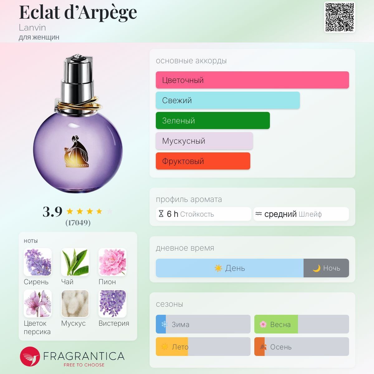 ️⃣ Lanvin - Eclat d`Arpege Аромат, как шедевр высокого искусства. Непревзойденное творение, достижение мастерства. Ненавязчивый и легкий, но в то же время притягательный, как главная героиня данной композиции - сирень. Неприторную сладость оттеняет и придает ей легкую терпкость лист чая. Состав аромата может показаться простым, но многогранные переплетения звучащих в нем нот, делают его гениальным. В точности, как и в искусстве: все гениальное - просто. Верхние ноты: зеленая сирень, лист чая Ноты сердца: пион, цветы персика Базовые ноты: амбра, мускус, китайский османтус, петитгрейн и кедр Аромат: цветочный🪻, фруктовый 🍋 Аккорды: 🌸цветочный 💚зелёный 🩵свежий Цена: 🤥2 мл - 200₽ 🤥30 мл - 2400₽ 🤑🤑🤑🤑🤑🤑🤑🤑🤑 Небольшое лирическое отступление. Пора прошлогодних салатиков, тяжелой и калорийной еды способствовала тому, что захотелось легкости и воздушности. Во всём😁 Долой вредную еду, долой плотные ароматы, сегодня все окна настежь, чтоб свежесть зимней капели наполнила каж