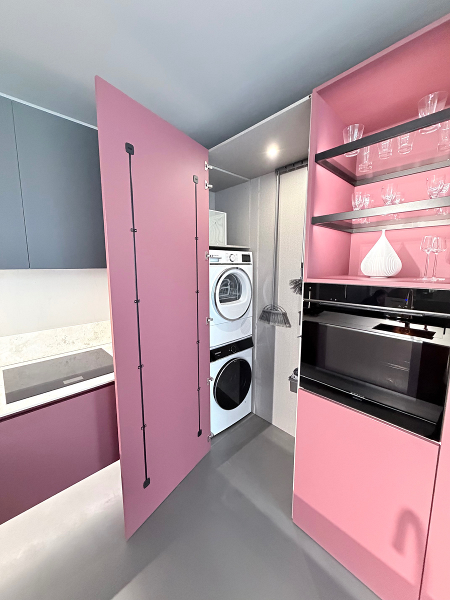 На первый взгляд — обычная стильная кухня. Но за фасадом кухонного модуля скрывается полноценная прачечная.