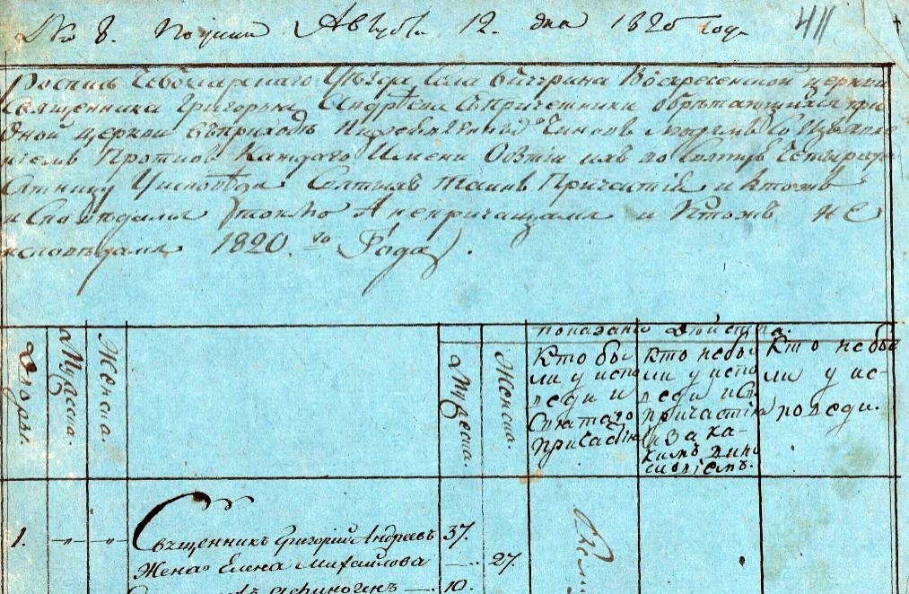 ГИА Чувашской Республики (ГИА ЧР), фонд № 225, опись № 7, дело № 41, стр. 834 скан. Подана августа 12 дня 1820 года. Роспись Чебоксарского уезда села Бичурина Воскресенской церкви священника Григория Андреева с причетники обретающихся при оной церкви в приходе ниже явленных чинов людям со изьявлением против каждого имени о бытии их в Святую Четыредесятницу у исповеди и Святых таин причастия, и кто ж исповедовался токмо а не причастился, и кто не исповедался. 1820 года. Духовные и их домашние. 5. Пономарь Яков Борисов. 51. Жена ево Агрипина Прокофьева. 45. Дети их: Евграф. 23. Николай. 13. https://yandex.ru/archive/catalog/64fee21f-37a3-42a7-8673-58e47678d6a7/834