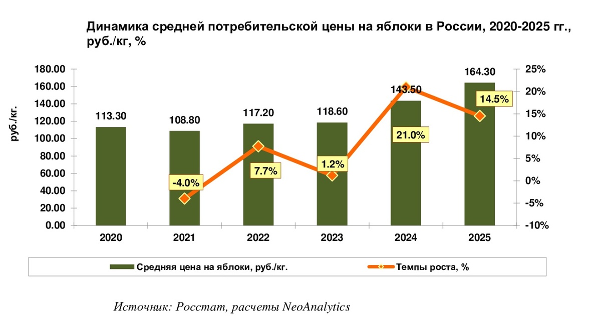В ходе ежемесячного мониторинга розничных (потребительских) цен на яблоки, проведенного NeoAnalytics, выяснилось, что за последние шесть лет средняя розничная цена на 1 кг. яблок выросла в 1,45 раз и сегодня составляет 164,3 руб./кг. Еще в 2020 г. яблоки были доступны покупателям в магазинах в среднем за 113,3 руб./кг.