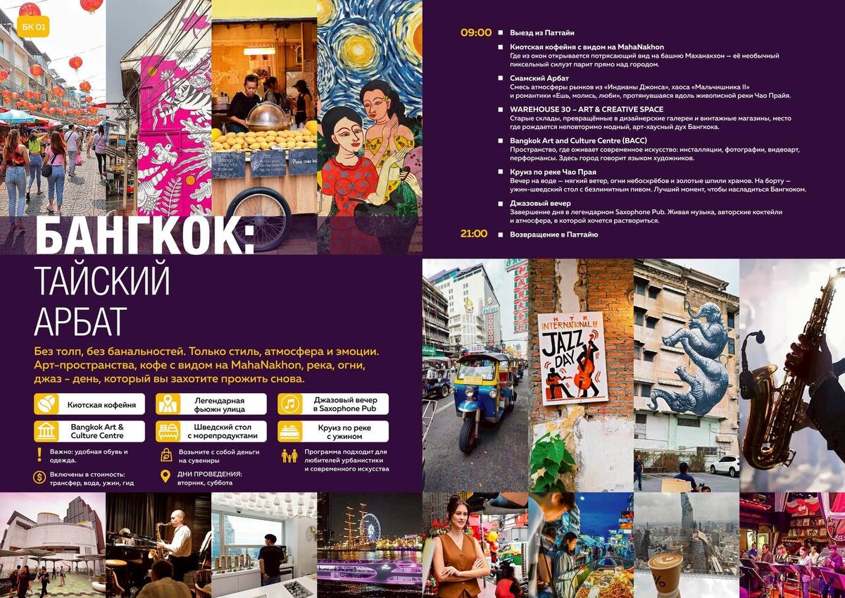 » Экскурсия по самому стильному и нетуристическому Бангкоку — про эстетику, искусство, улицы с характером и вечерний джаз 🎷 ⸻ 📍 Программа тура 09:00 — встреча с гидом и выезд из отелей Комфортабельный транспорт, начало эстетического дня. ⸻ ☕️ Эстетика Бангкока Стильная киотская кофейня с видом на небоскрёб Маханакхон. Пиксельный силуэт башни будто парит над городом — идеальное место, чтобы поймать ритм современного Бангкока и настроиться на путешествие. ⸻ 🌿 Сиамский Арбат — живая легенда Улица, на которой вы точно не были. Прогулка вдоль реки Чао Прайя, входящая в ТОП-40 самых стильных улиц мира. Здесь в одном ритме: • португальская колониальная архитектура • старинные шопхаусы • масштабные муралы и стрит-арт • ароматы уличной еды Атмосфера будто из фильмов «Индиана Джонс», «Мальчишник II» и «Ешь, молись, люби». ⸻ 🏭 WAREHOUSE 30 — ART & CREATIVE SPACE Бывшие склады, превращённые в дизайнерские галереи, винтажные магазины и арт-пространства. Место, где рождается модны