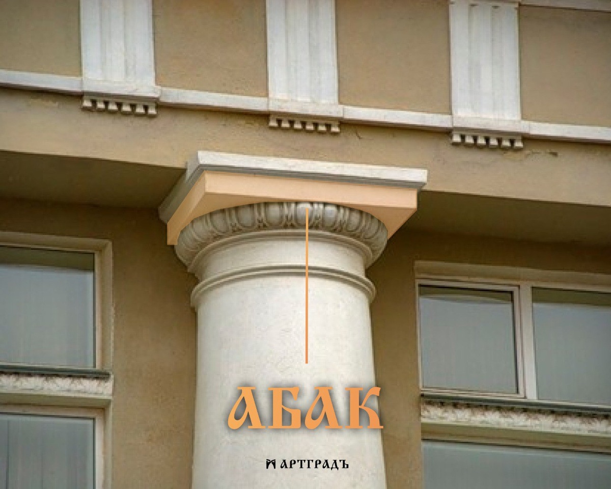 Абак (от греч. abax — доска) — это верхняя плита капители колонны, пилястры или полуколонны в классических архитектурных ордерах. В плане она обычно имеет квадратную форму и служит важным конструктивным элементом, переносящим нагрузку от антаблемента (верхней части ордера) на ствол колонны. В зависимости от ордера, очертания абак варьируются: В дорическом и ионическом ордерах края плиты, как правило, прямые. В коринфском ордере и в производном от него римском композитном ордере края часто делают вогнутыми, а саму плиту могут украшать декоративной профилировкой. Несмотря на преимущественно утилитарную функцию — обеспечение надёжной опоры для несомых конструкций, — абака также играет роль визуального завершения капители, создавая переход между колонной и антаблементом. Её размеры и пропорции в античной архитектуре строго рассчитывались в зависимости от веса вышележащих элементов. Например, в ионическом, коринфском и композитном ордерах, где абаки имеют относительно небольшую толщину, н