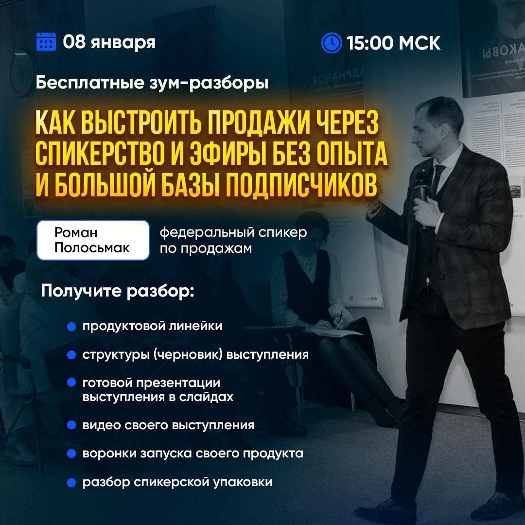 🔍 Зум-разборы «Как выстроить поток клиентов через спикерство» 8 января (четверг) в 15:00 МСК в Zoom пройдут живые разборы: «Как выстроить продажи через спикерство и эфиры без опыта и большой базы подписчиков?» Если ты: • уже выступаешь, но это не даёт заявок, • не понимаешь, где связка между выступлением и продажей, • не знаешь, во что упаковать компетенцию, • или просто хочешь понятную систему продаж через сцену — тогда тебе на этот разбор. 👉 Зарегистрироваться и узнать подробности можно здесь: https://salebot.site/1online_1?utm_source=tg&utm_medium=razb&utm_campaign=08_01&utm_content=z5
