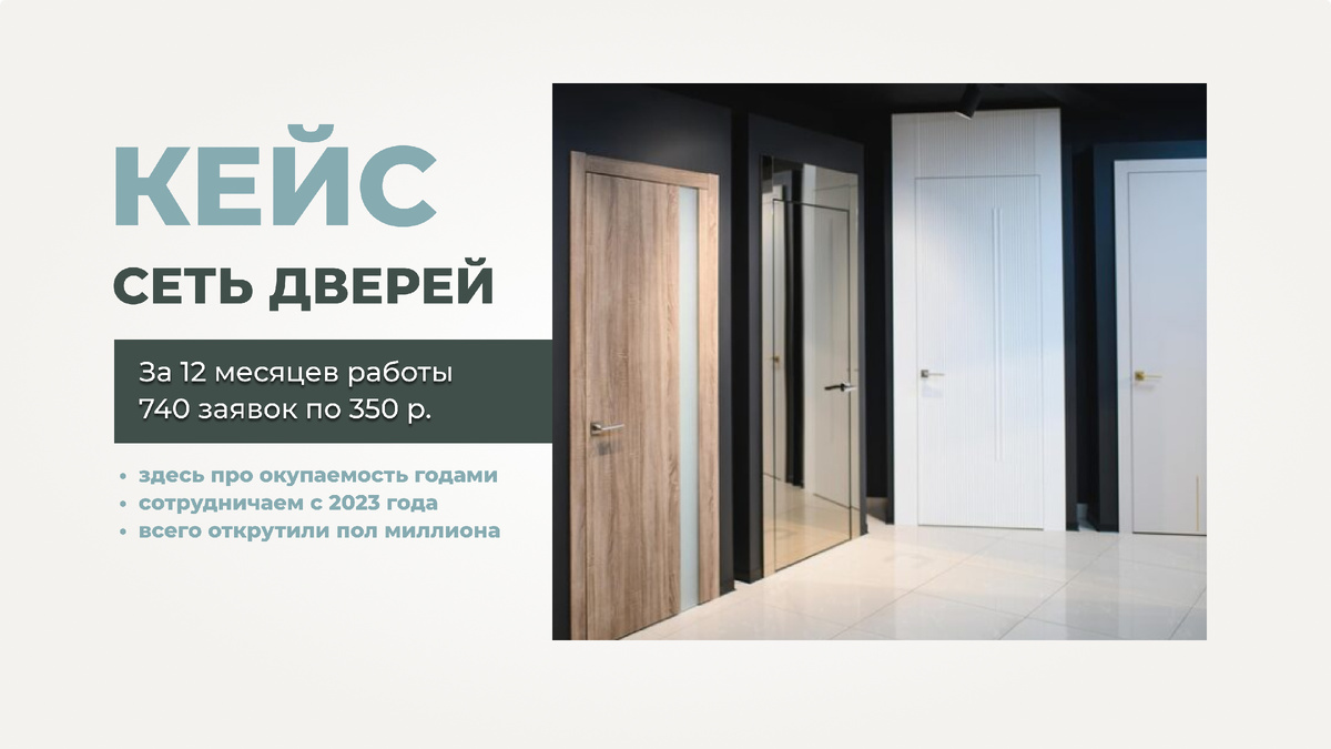 Задача: привести заявки на межкомнатные двери по определённому гео. В своём небольшом городе - заявки на входные и межкомнатные. Анонс акций. Работа с повышением узнаваемости, подписки на сообщество Вк.