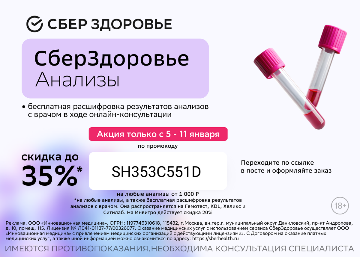 Успей ввести промокод с 05.01.2026 по 11.01.2026 сдать анализы можно в течение 14 дней.