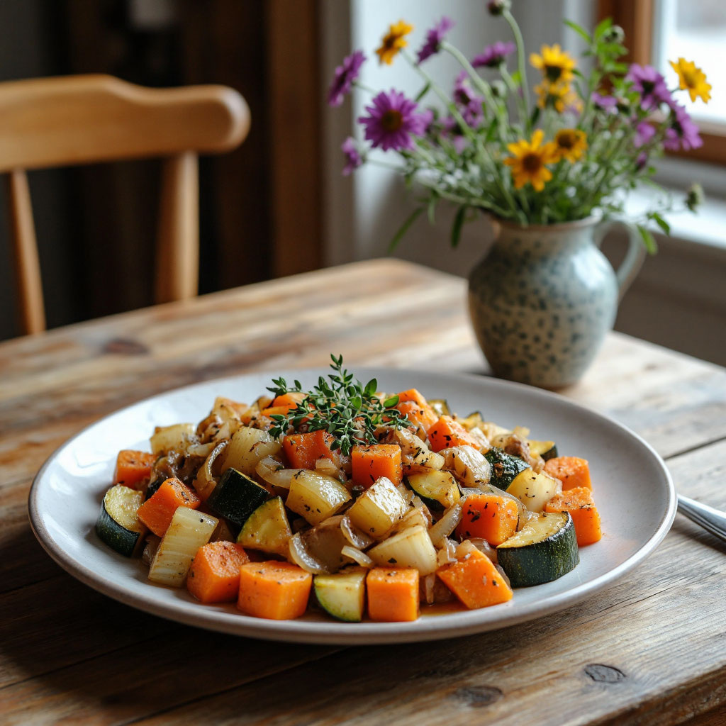 Нарезанные овощи тушу на слабом огне с маслом и пряностями 15–20 минут. Добавляю чеснок в конце, чтобы сохранить аромат.