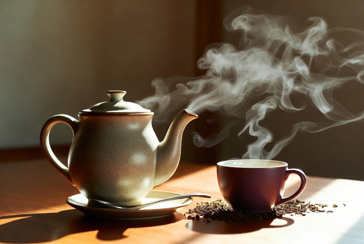 Пришло время. Ты берёшь чайник за ручку — она уже горячая, но не обжигающе, а ровно настолько, чтобы напомнить о живом тепле внутри. Наклоняешь его над толстостенной чашкой, цвета спелой сливы. И льешь.