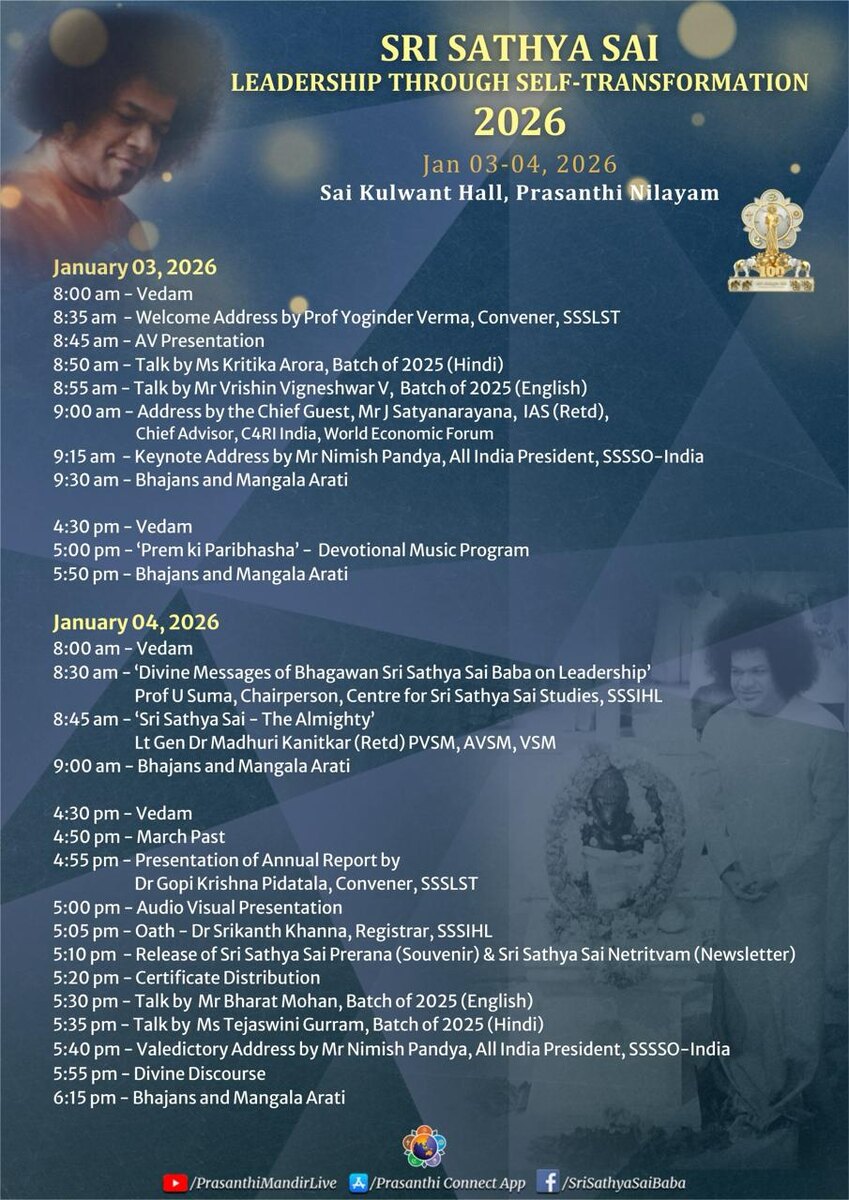8:30 – Профессор Сума, председатель Университета Шри Сатья Саи (SSSIHL) передаёт «Божественные послания Бхагавана Шри Сатья Саи Бабы о лидерстве»