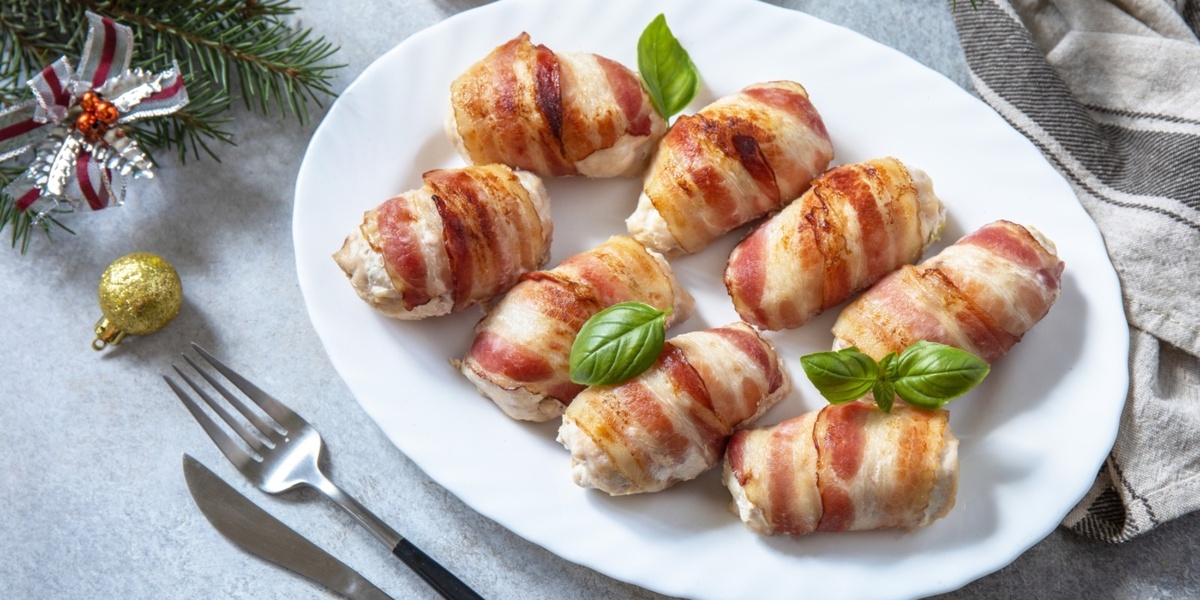 Скрутите каждый кусочек куриного филе с начинкой в рулетик. Оберните его полоской бекона, чтобы придать блюду сочность и аромат. 5️⃣ Запекание