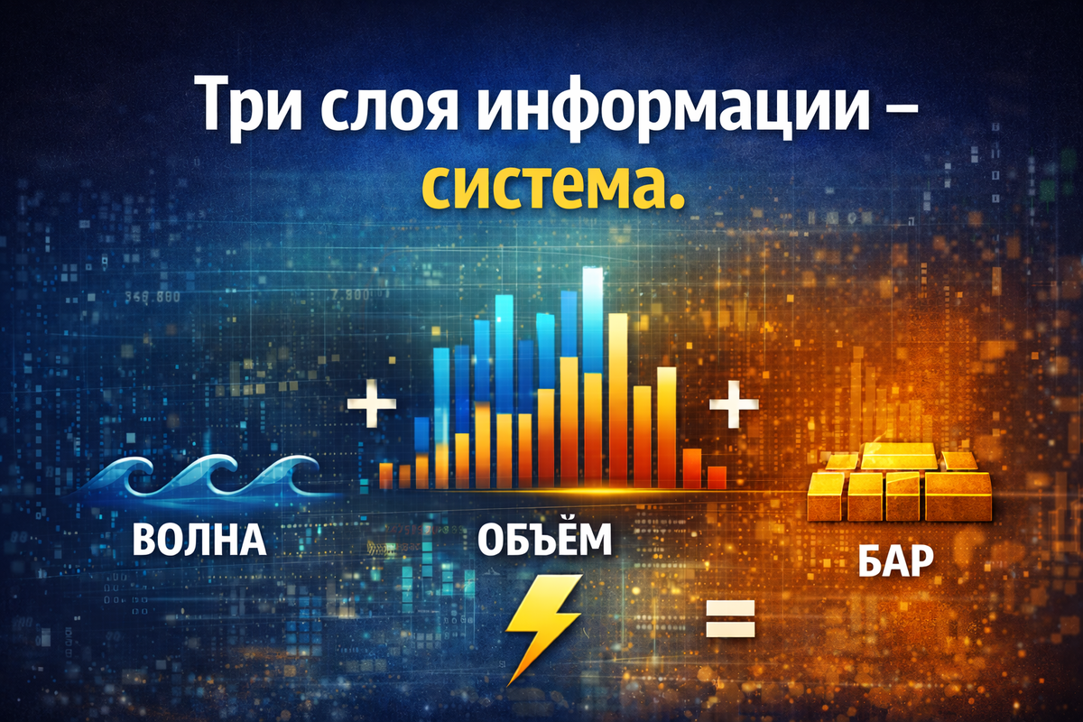 Автор: Роман, трейдер с опытом 14 лет. Заходите на мой канал в ТГ https://t.me/+sxeVquLQVToyOWEy Одна из главных ловушек в трейдинге — смотреть на рынок плоско. Видеть либо только движение цены, либо только объёмы, либо только отдельные бары и пытаться на основании этого принимать решения. Такой подход создаёт иллюзию анализа, но почти всегда приводит к фрагментарному пониманию и нестабильным результатам. Рынок устроен сложнее. Он многослоен, и каждая рыночная ситуация одновременно существует сразу в нескольких измерениях. Пока трейдер видит только один слой, он неизбежно теряет контекст и начинает додумывать то, чего на самом деле нет. 🧩 Первый и самый очевидный слой — волна. Это структура движения цены во времени. Волна показывает не отдельные колебания, а логику развития движения: импульсы, паузы, смену фаз, ускорение и замедление. На уровне волны трейдер отвечает на базовые вопросы: Важно понимать: волна — это не прогноз и не форма ради формы. Это способ увидеть организованность д