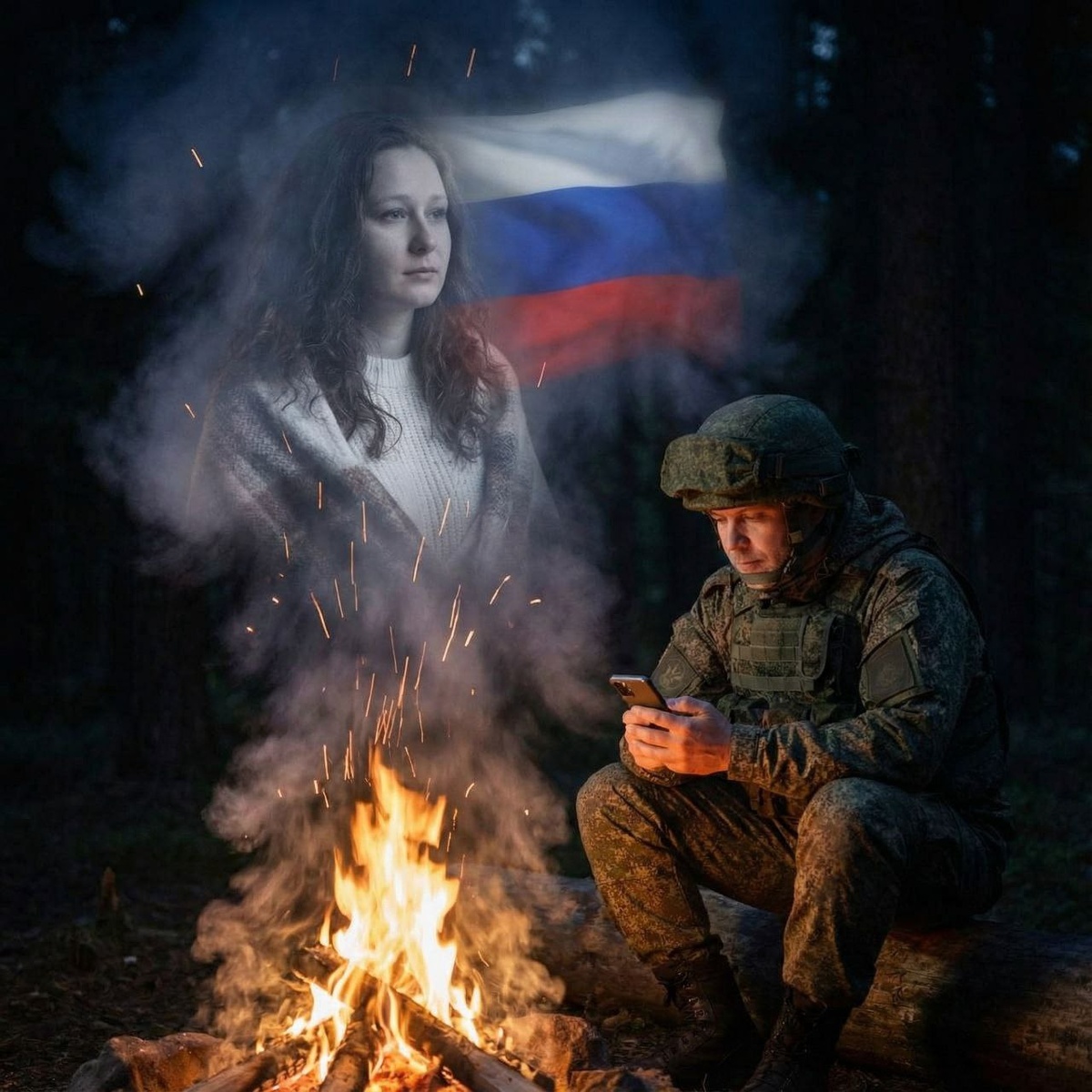 изображение солдата в современной российской камуфляжной форме и шлеме, сидящего в ночном лесу у яркого костра. Солдат смотрит в экран смартфона. Над ним из дыма костра материализуется призрачный, полупрозрачный образ молодой девушки с длинными волнистыми темными волосами, в белой одежде. На фоне дыма виден мягко светящийся триколор (белый, синий, красный). Атмосфера меланхоличная, искры от костра летят вверх, глубокие тени, кинематографичное освещение. Эффект двойной экспозиции и мистического дыма ➡️ Тут БОТЫ 💵 Отблагодарить 💥boost