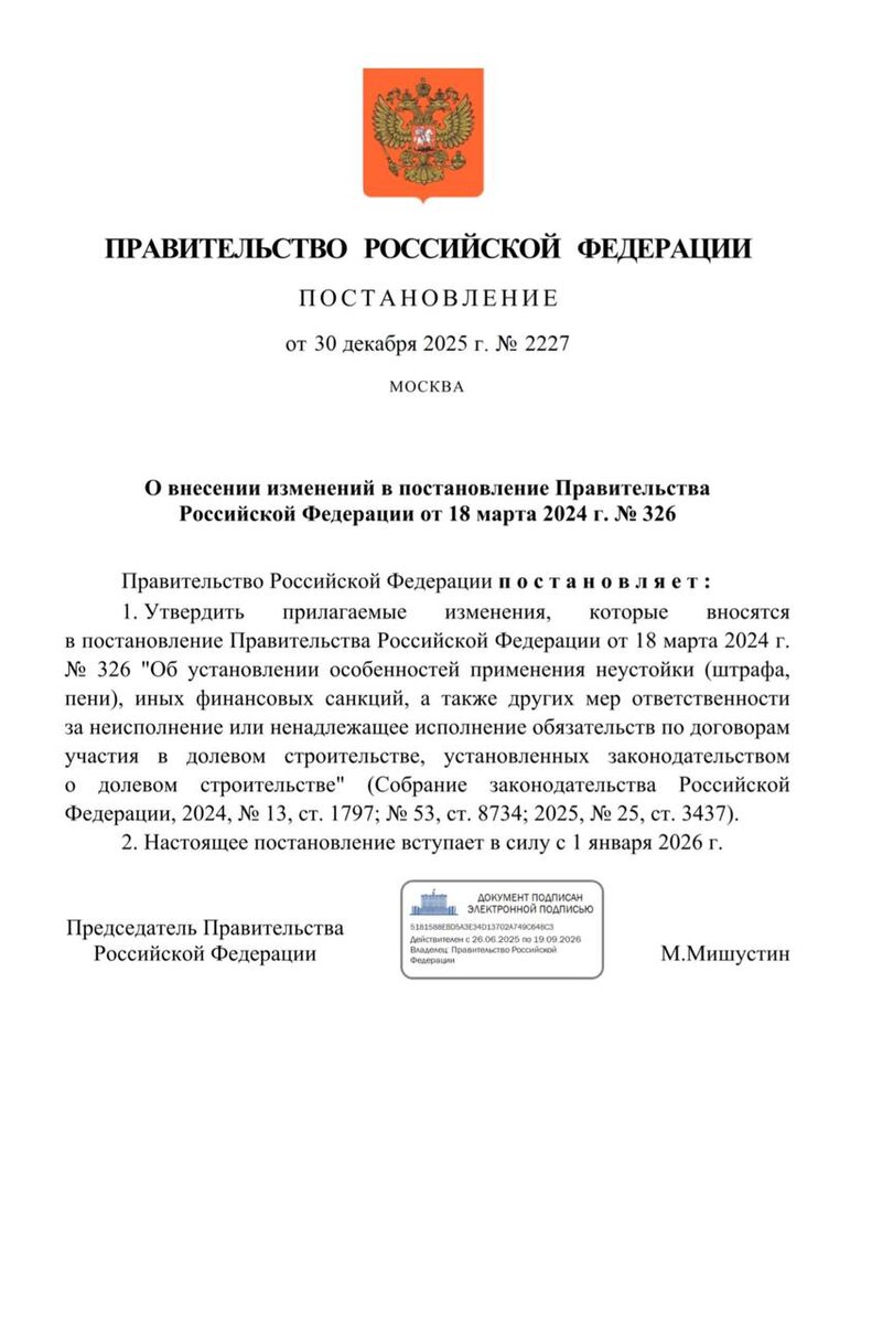Постановление правительства с соответствующими изменениями было опубликовано 31 декабря 2025 года. Таким образом, получить деньги в качестве неустойки от застройщика можно будет не ранее 31 декабря 2026 года. Президент России в декабре поручил не продлевать мораторий на штрафы. #Недвижимость @if_news