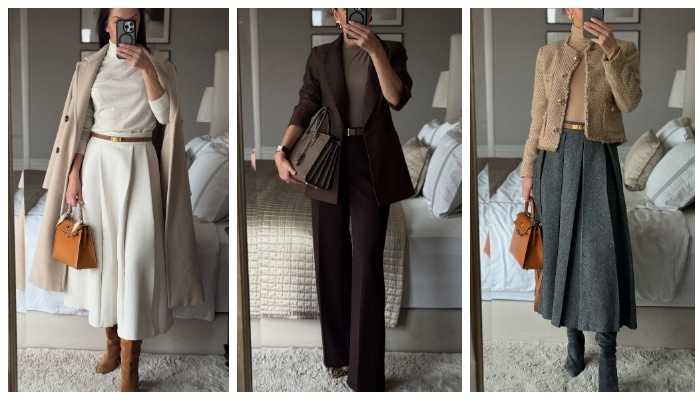 Современный офисный стиль всё чаще отказывается от показной строгости в пользу сдержанной элегантности. Лаконичные образы — это про продуманные линии, нейтральную палитру и безупречную посадку, где каждая деталь работает на целостность. Представленные образы наглядно демонстрируют, как выглядит актуальный деловой гардероб сегодня. Светлая юбка в сочетании с базовым трикотажем создаёт мягкий, но собранный силуэт. Такой образ выглядит профессионально и при этом не перегружен деталями. Аналогичный приём используется и в более тёплой цветовой гамме — молочные, бежевые и карамельные оттенки поддерживают ощущение спокойствия и уверенности. Минималистичные аксессуары и аккуратная обувь подчёркивают чистоту линий. Твидовые жакеты и шерстяные юбки в серо-коричневой гамме добавляют образам структуры. Они отсылают к классике, но благодаря современному крою выглядят актуально. Высокая посадка юбок, чётко обозначенная талия и лаконичные сумки формируют образ собранной и уверенной женщины, для кото