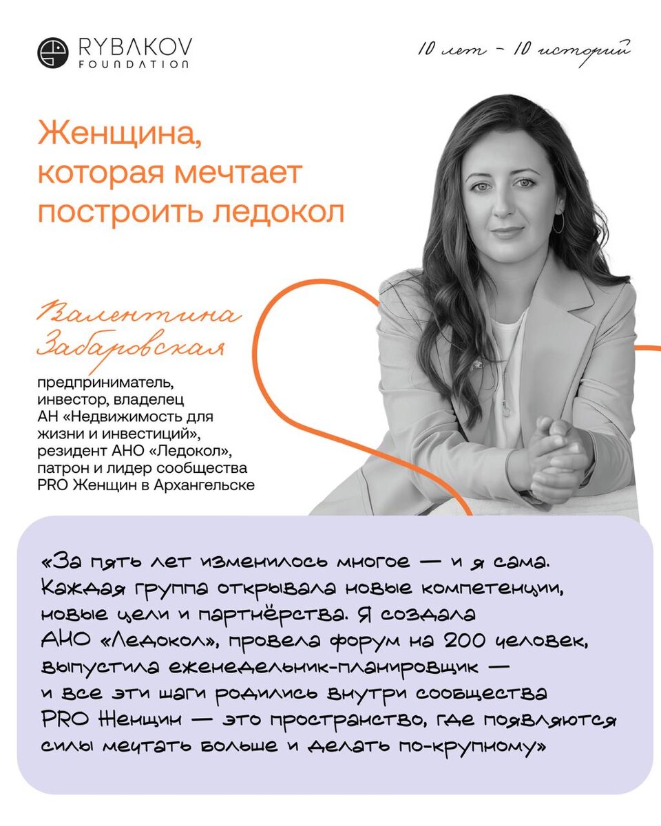 Для Валентины Забаровской мечта построить ледокол имени её отца — моряка с сорокалетним стажем — стала символом масштабного проекта, который объединяет личную историю и развитие регионов. Но путь к таким масштабам начался с малого — с участия в сообществе PRO Женщин, куда Валентина пришла в 2020 году. Методология сообщества PRO Женщин основана на работе в малых группах — пространстве доверия и поддержки, где женщины встречаются регулярно, обмениваются опытом, пробуют новые роли и учатся ставить цели, которые сложно достигнуть в одиночку. За пять лет Валентина провела более десяти групп, и каждая стала новым этапом её развития. Появились первые проекты — собственный еженедельник-планировщик, форум «Инвестиции для каждого» на 200 участников, расширение бизнеса и новые партнёрства. Постепенно оформилась и главная инициатива — АНО «Ледокол», работающей на развитие территорий Арктической зоны. Сообщество PRO Женщин стало местом, где эта мечта обрела форму и поддержку, а сама Валентина вск