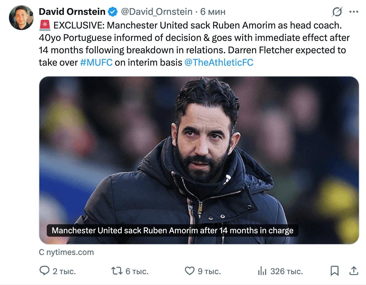 "Манчестер Юнайтед" уволил своего главного тренера Рубена Аморима ⚡