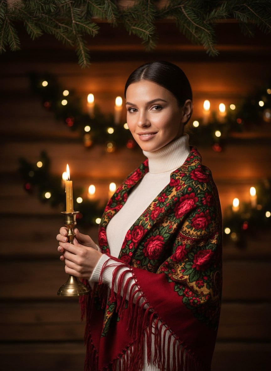 🔥 7 января уже близко, а у тебя еще нет атмосферного фото для сторис? Исправляем. Закидывай селфи в @SnapToVideo_bot, копируй промпт и получай идеальный праздничный портрет с сохранением своего лица. ⚡️ Используя загруженное селфи в качестве точного эталона лица со 100-процентным совпадением (--face_fidelity 1.0), создайте фотографию по описанию, сохранив полное сходство с оригиналом. Фотографически реалистичный [художественный поясной портрет] женщины в атмосфере православного Рождества. Она [стоит вполоборота, глядя в камеру с теплой улыбкой]. Одета в [белоснежный кашемировый свитер с высоким горлом и накинутый на плечи тяжелый шерстяной платок с красными цветочными узорами и бахромой]. [Интерьер старинного дома с бревенчатыми стенами, украшенного еловыми ветками и мерцающими свечами]. В руках [старинный подсвечник с горящей свечой]. [Мягкое боковое освещение от пламени свечи и теплые блики гирлянд на фоне]. Глубокие тени, малая глубина резкости, фокус на глазах, объектив 50mm f/1