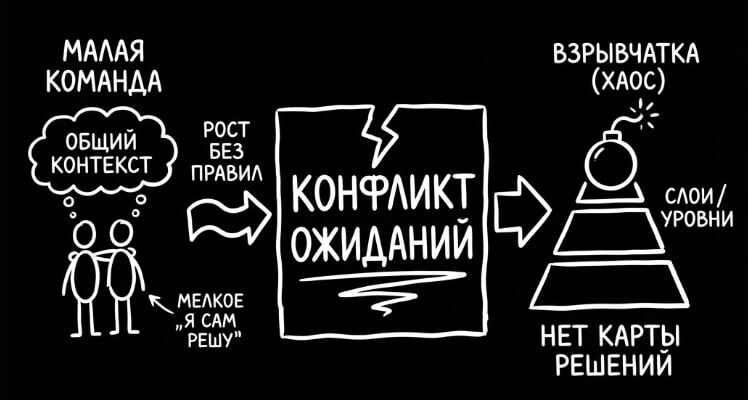 👉 прошлый пост Проблема редко начинается с больших ошибок. Она начинается с мелкого “чтобы не дергать”. Это звучит красиво. - Я не хотел отвлекать тебя - Ты занят, я сам решу - Так быстрее И пока компания небольшая, это работает. Потому что контекст у всех одинаковый. Вы сидите рядом, слышите одни и те же разговоры, видите одни и те же цифры. Даже если не проговаривали правила, вы как будто “на одной волне”. Но когда компания растет, волна исчезает. Появляются уровни. Слои. Части информации распределяются по людям. И тут отсутствие договоренностей становится взрывчаткой. У нас не было четко прописано: - какие решения заместитель принимает сам. - какие решения обязательно согласуются. - какие решения вообще табу без собственника. Мы думали, что “и так понятно”. Только у каждого свое “понятно”. Я ожидал одного. Он искренне считал другое. И оба были уверены, что действуют правильно. Самое важное. Это не конфликт людей. Это конфликт ожиданий. Вывод. Если карта решений не проговорен