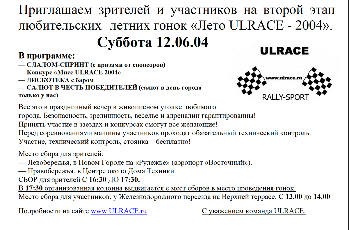 Не за горами был и следующий, второй этап. 12 июня . Было принято решение провести его в режиме автомобильного слалома , все в той же локации, грузовой порт «Королёвка» на Нижней террасе. Внизу на берегу реки Волга есть две асфальтовые площадки, мы определенным образом сконфигурировали трассу , поставили фишки ограждения. Для популяризации сделать ее в виде такого небольшого автослалома с пенализацией за сбитые фишки. Ну и естественным образом, кто быстрее проедет данную конфигурацию, не собьет фишки. И в конечном итоге так определялся победитель. Было несколько разных конфигураций и вариантов проведения. Остановились на таком. Провели значительную рекламную компания, которая сводилась к распространению листовок по городу, по салонам сотовой связи, просто на улицах в центре города раздавали, и в Новом городе на улицах. Вот так выглядела листовка. Необходимо было проехать 2 круга, при это время 1-го круга не всегда фиксировалось. Чем-то особенным этот этап не запомнился, кроме того,